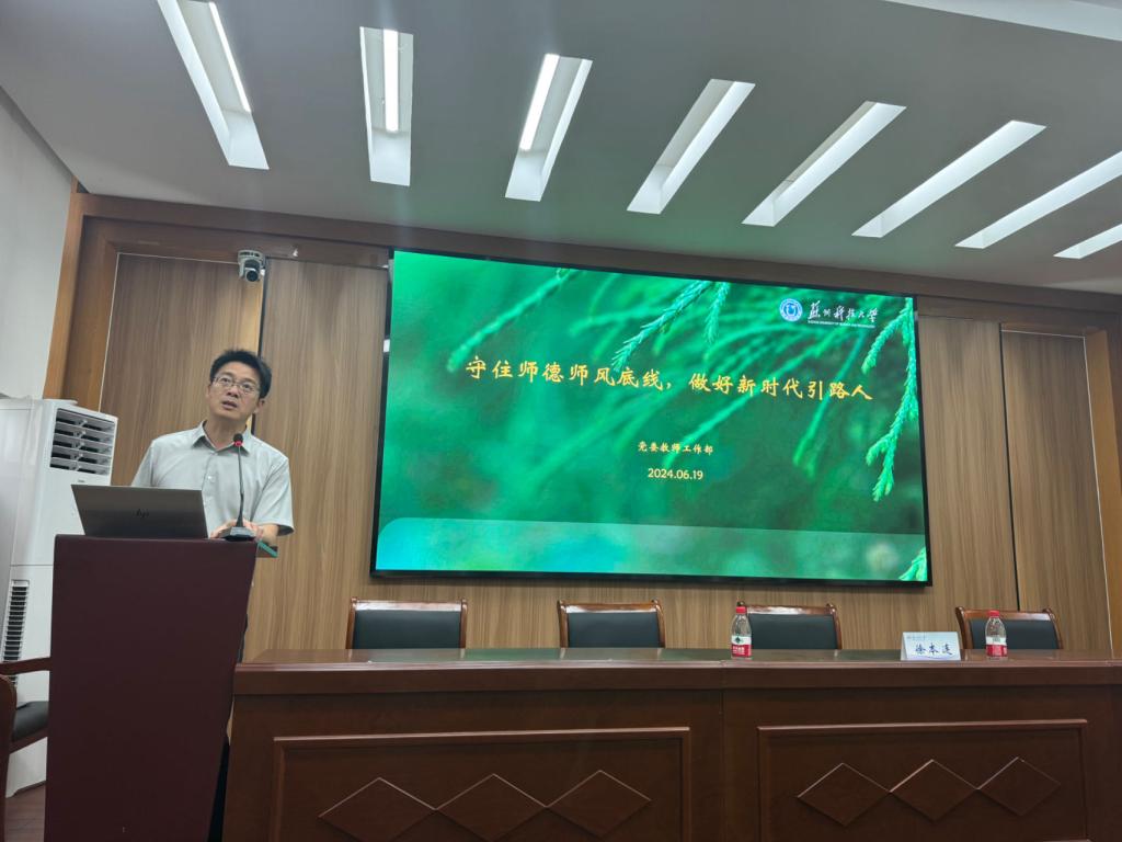 徐本连为大家讲述了习近平总书记的教书育人观,对“四有好老师”“四个引路人”“大先生”等关键词进行了深入浅出的阐述,并对我校的师德师风建设考核评价体系及相关文件进行详细解读。