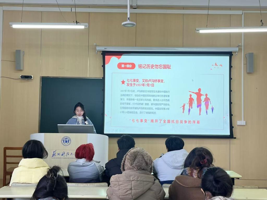 活动开始,主讲人以七七事变引入,旨在弘扬民族精神,凝聚奋进力量。引导学生们铭记历史,勿忘国耻,从“七七事变”中汲取坚韧不拔、艰苦奋斗的精神伟力,以一往无前的奋斗姿态、奋发图强的精神面貌、奋力拼搏的顽强意志,在时代发展的潮流中“踏浪前行”。为了让同学们勿忘历史,主持人继续通过淞沪会战启发学生,硝烟虽已散去,但曾经的苦难不能忘。我们要以史为鉴、勿忘国耻、砥砺前行,接过历史交给我们的“接力棒”,以“起步即加速、开局即冲刺”的奋进姿态建功新时代。不忘初心,牢记使命,必须牢固树立共产主义远大理想。这要求我们广大青年铭记并传承革命先辈的赤诚信仰,将“忠诚”刻进骨子里,把“小我”融进党和国家事业的“大我”,从英烈精神中汲取爱国力量。