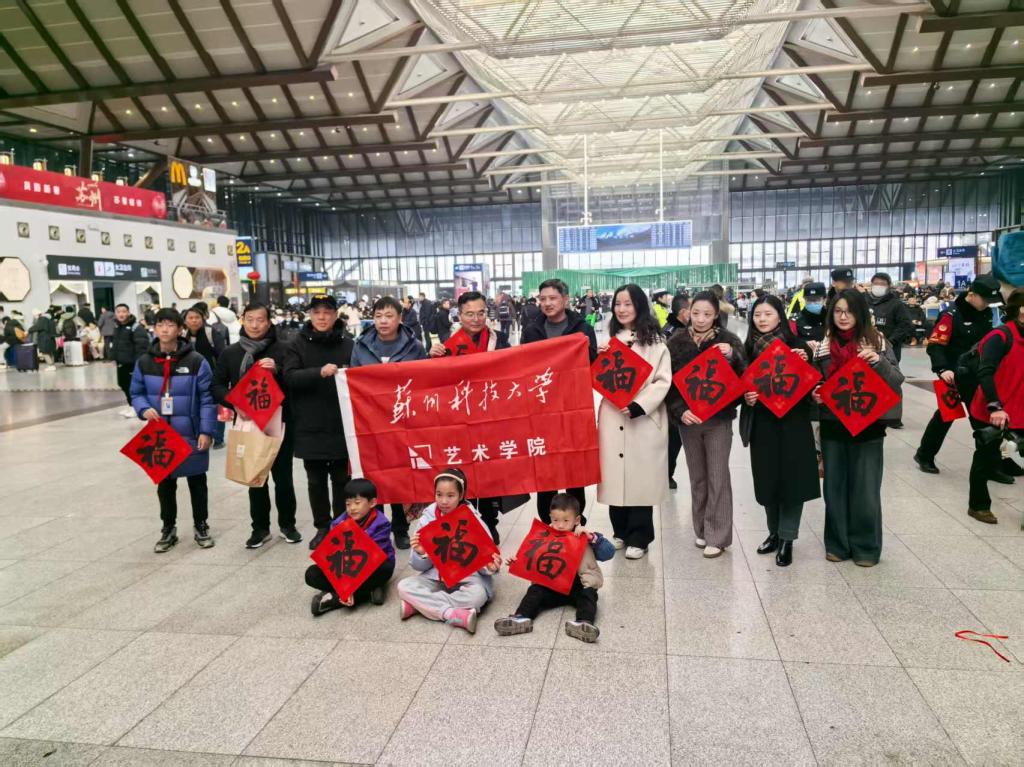 在新年春运的第一天,来自苏州市书法家协会的书法家们将写好的上千幅“福”字带到苏州火车站,与各承办单位的工作人员一起,将新春祝福送到每位旅客手上,祝愿大家灵蛇开运,“巳巳如意”。