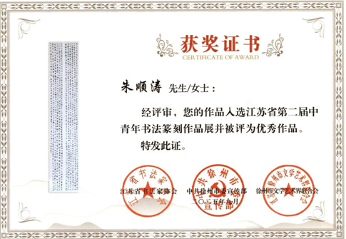 研一学生朱顺涛在江苏省书协等主办的江苏省第二届中青年书法篆刻展中表现不俗,其行书作品荣获优秀奖。