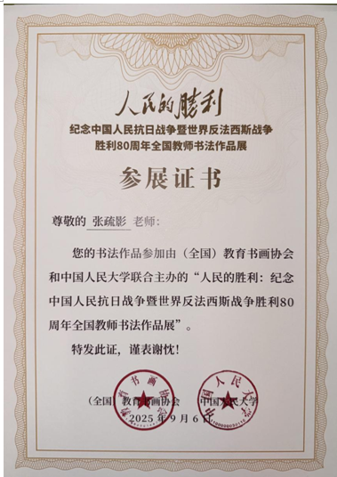 研二学生张疏影的行草作品成功入展由(全国)教育书画协会等主办的“人民的胜利——纪念中国人民抗日战争暨世界反法西斯战争胜利80周年全国教师书法作品展”,近300幅作品入选。该展览于9月上旬在中国人民大学博物馆隆重开幕。张疏影同学以校外特聘书法辅导教师的身份参赛,其作品凭借扎实的书法功底和独特的艺术魅力从众多参赛作品中脱颖而出。